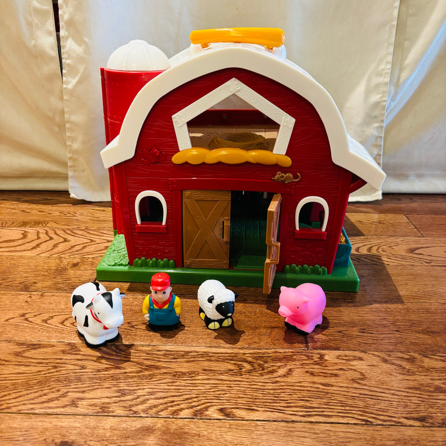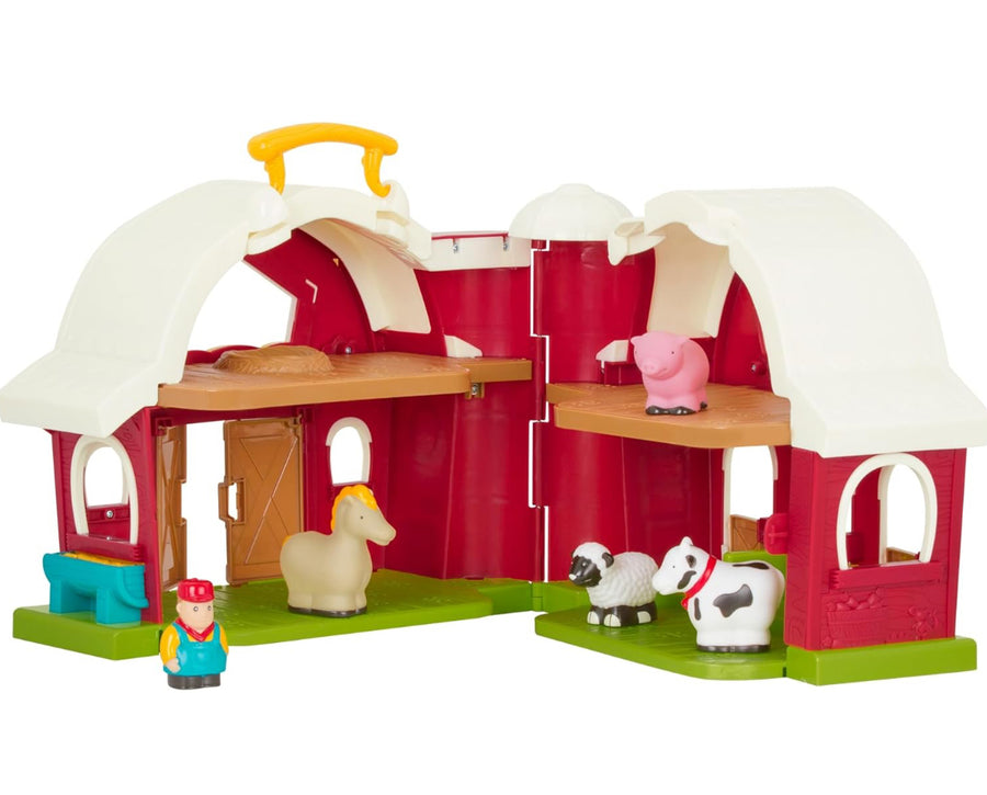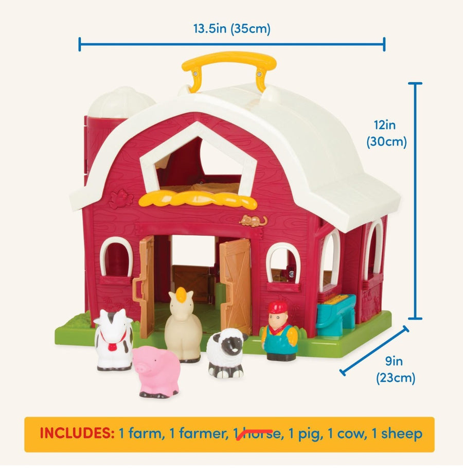 Battat Big Red Barn with four farm characters. Includes a handle for easy transport and on-the-go play! Farm opens up for endless ways to explore.