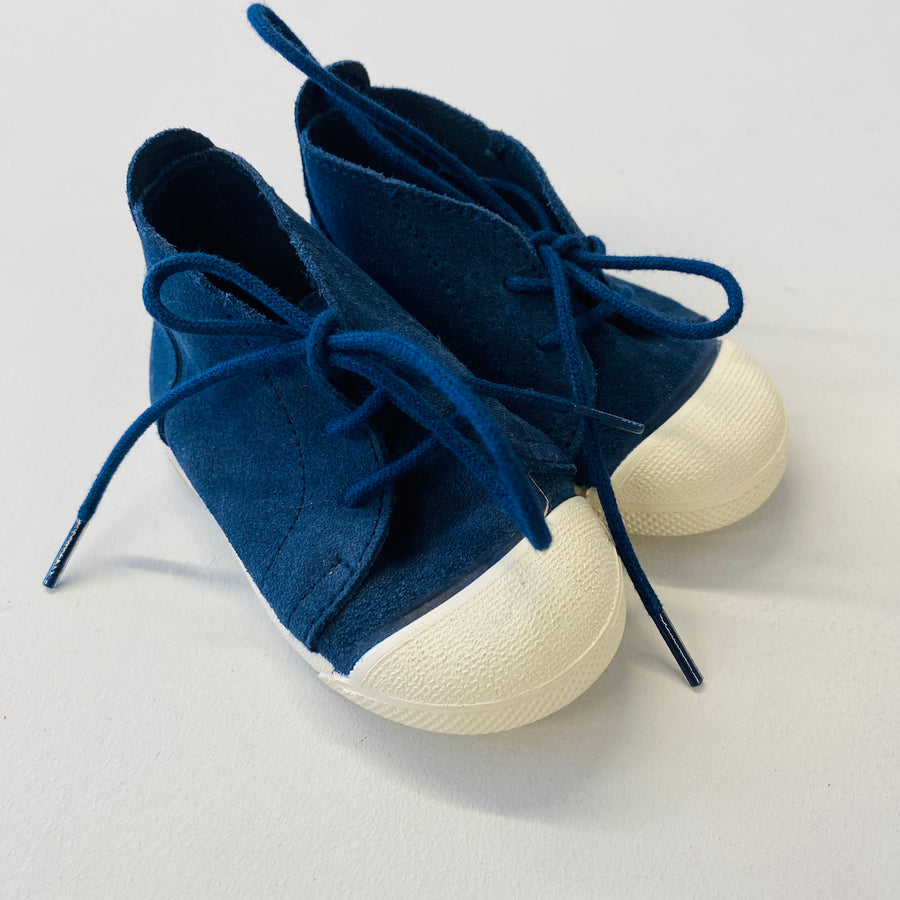 Blue suede or faux-suede shoes with rubber soles. Made in Spain.