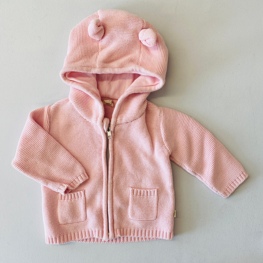 Pink knit hooded cardigan with ear detail; 100% organic cotton