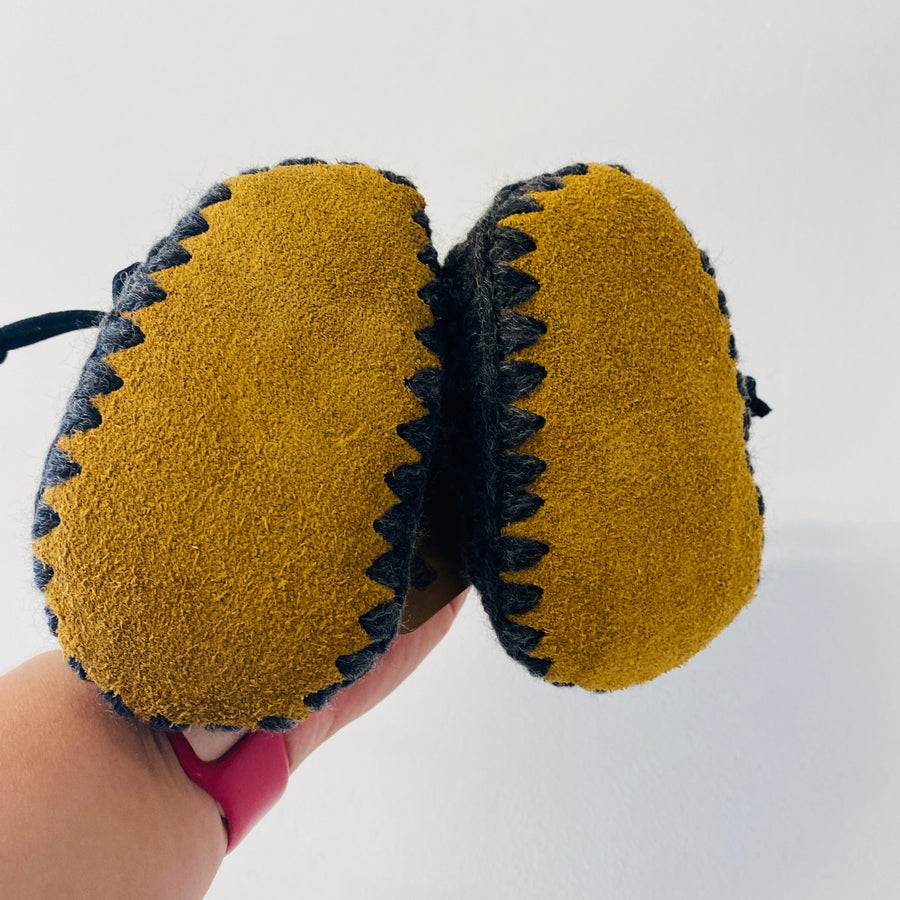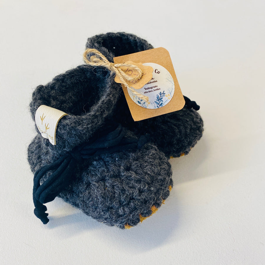 Knit charcoal booties. Birdees Booties uses repurposed leather & shearling to create booties for tiny toes and big ones too.
