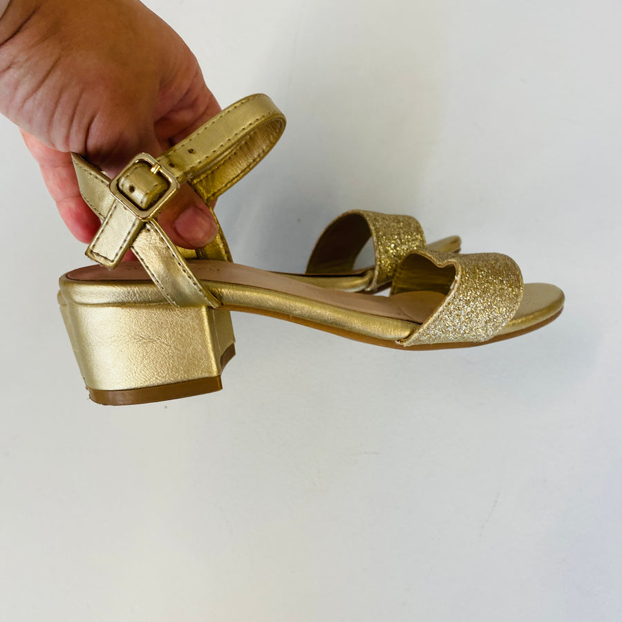 Kitten heel gold sandals with glitter; ankle straps