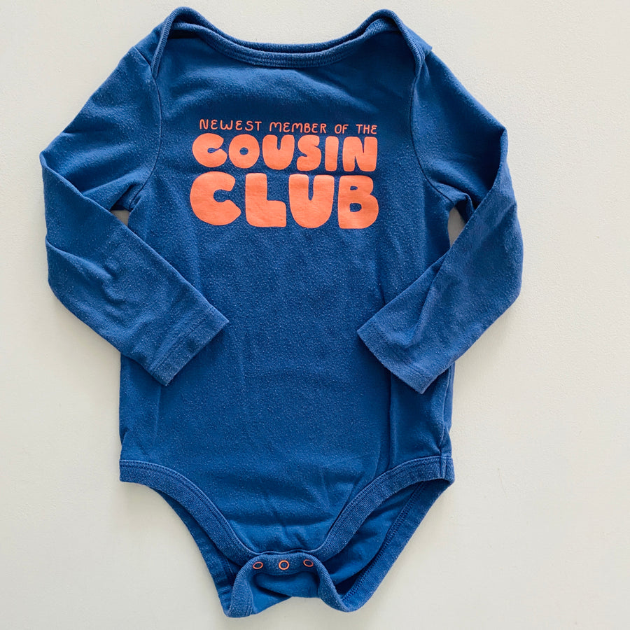 Long-sleeved blue bodysuit with 'Newest Member of the Cousin Club' print